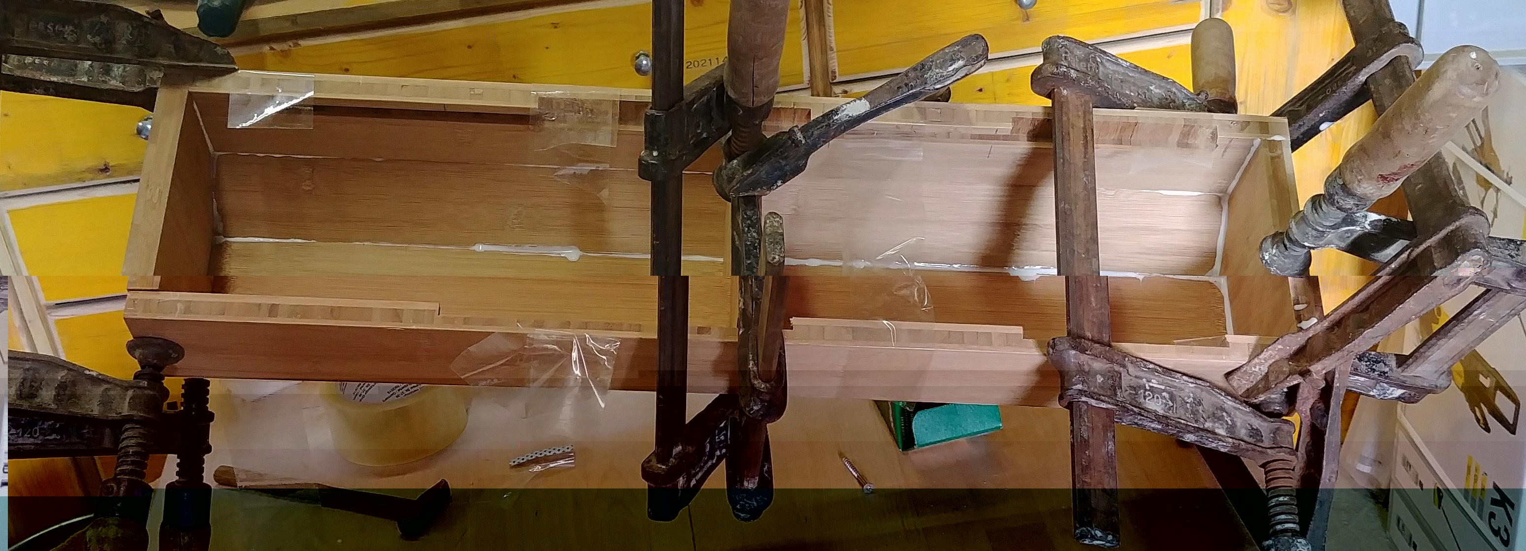 Zwecks den druckstellen durch die zwingen muss ich sagen das da keine entstanden sind. Das Bambus ist hart genug um die belastung aus zu halten. Unterlagen beim zwingen nutze ich meist nur bei weichholz (kiefer und fichte) die harthölzer vertragen da mehr.