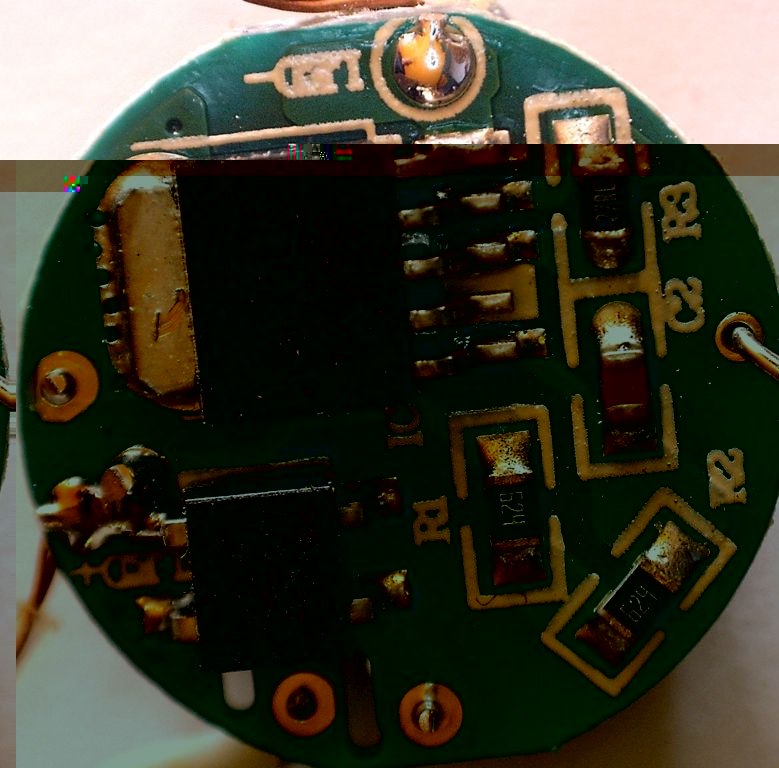Am Übergang zwischen E14-Sockel und Plastikkragen gab es bei beiden Birnen schon Schmauchspuren. Der nur punktgepreßte Sockel ließ sich problemlos mit einem Elektrikerschraubenzieher entfernen. Beim ersten Exemplar hatten sich die Drähte schon selbst ausgelötet, ebenso war der Begrenzungswiderstand verdampft und einer der Wechselstromanschlüsse des Gleichrichters. Beim zweiten war der Widerstand noch erkennbar und die Drähte noch vorhanden, aber der Anschluß vom Gleichrichter ebenfalls weg. In beiden Fällen hatten die Elkos noch keine dicken Backen gemacht. Die Drähte zu den LEDs hatten sich auch abgelötet, insofern besteht wenig Hoffnung für die LEDs...
