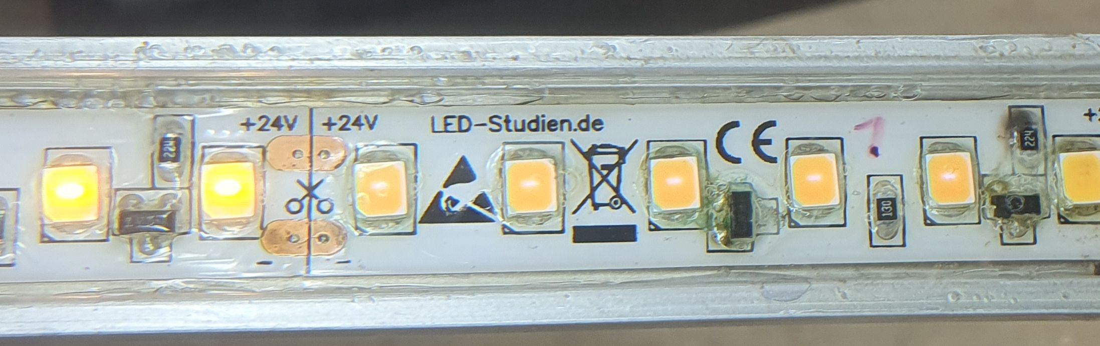 Ich hoffe mal, dass nach dem dritten Auftrag da jetzt auch alle Ränder dicht sind und dann würde ich das in den Dauertest geben. Eine generell Lösung kann das aber so leider auch nicht sein, denn über Kopf mit LEDs nach unten (nicht selten bei mir) ist das undenkbar zu machen so. Tropft heftig und wenn ich das dann immer 3 mal so dick auftragen muss - das geht leider nicht. Vermutlich werde ich doch noch mal den PLASTIK 70 testen. War bisher eigentlich das beste Ergebnis. Der Teststreifen leuchtet auch noch. Ich bräuchte für den nur eine dünnere Düse für das Spray damit ich gezielt ins Profil sprühen kann ...