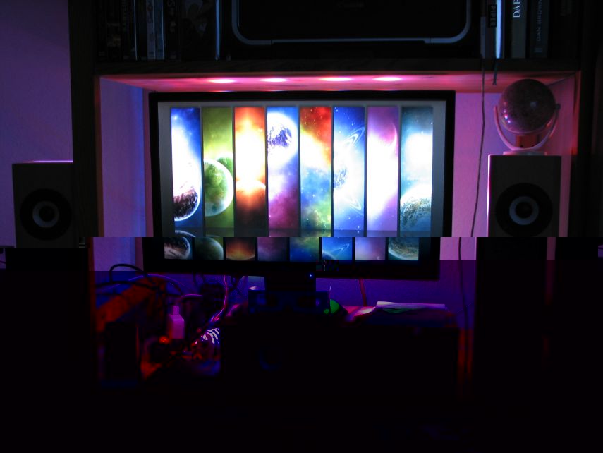 So, hier meine Hintergrundbeleuchtung für meinen TV-Monitor mit Vesa 100 halterung aus einer Mandarinenkiste und ein paar Holzleisten, die auf gehrung geschnitten sind. Das ganze hängt an einem 12V Schaltnetzteil.