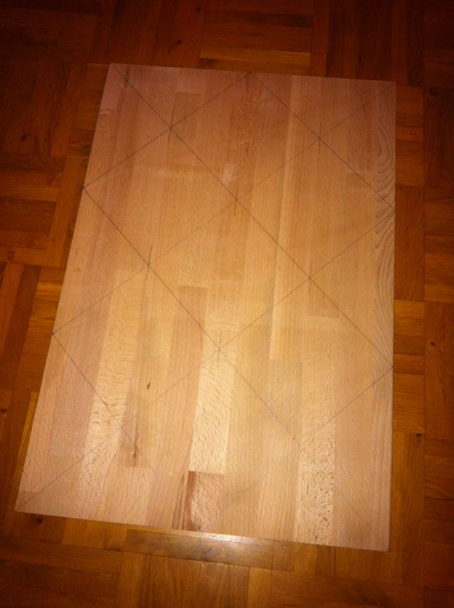 Hier hab ich angezeichnet wo die Löcher hinsollen. Da wo sich die Linien kreuzen kommt jeweils eins hin.