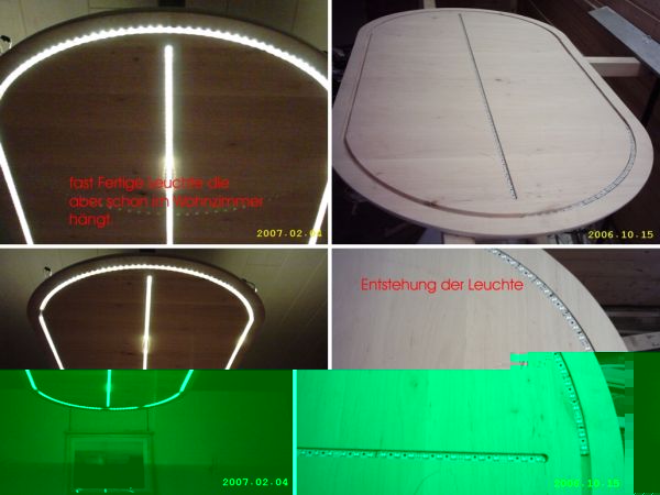 Schon während der Renovierung meines Wohnzimmers habe ich mir überlegt was ich für eine Leuchte über den Tisch hänge. Alles Suchen half nix, es gab keine Lampe die mir gefiel. So habe ich mich darangemacht selbst eine Leuchte zubauen. Da ich keine Halogenbeleuchtung haben wollte bin ich auf der Suche nach Altenativen hier hängen geblieben. Um zu testen ob die LEDS meinen Vorstellungen entsprechen hab ich erstmal zum Test zwei SuperFlux-LED Leiste warmweiß bestellt. Da alle Testergebnisse meinen Vorstellungen entsprachen habe dann den Rest bestellt. Die Leuchte der Form des Tisches nachempfunden so das sich die ovale Form ergeben hat. Die Leisten selbst liegen in einer eingefrästen Nut so das sie nicht hervorstehen. Um die Rundung der Leisten zu ermöglichen habe ich eine Lötform gebaut und die Leiste in jeweils 3er Einheiten in die Rundung gelegt. Alle Leiterbahnen habe ich Vorder wie Rückseitig wieder zusammen gelötet. Widerstände die beim Zerscheiden zerstört worden sind habe ich ersetzt. Die Lampe ist durch einen Seilzug in der Decke in der Höhe verstellbar. Die Leistungsaufnahme liegt ca. bei 40Watt.
