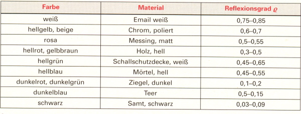 Auch der Reflektiongrad von Decke, Wänden und Boden und deren Farbe und Material haben Einfluss auf den Raumwirkungsgrad. Den Reflektionsgrad ermittelt man Näherungsweise über diese Tabelle.