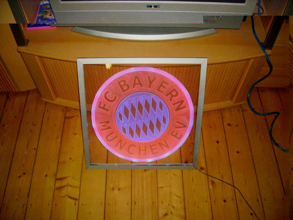 Anschließend wurden in den Rand Löcher gebohrt, die dann die entsprechenden LED-Farben getrennt nach Platten aufnahmen. Mit den entsprechenden Vorwiderständen wurde das Ganze dann mit einem 12V-Netzteil gespeist.