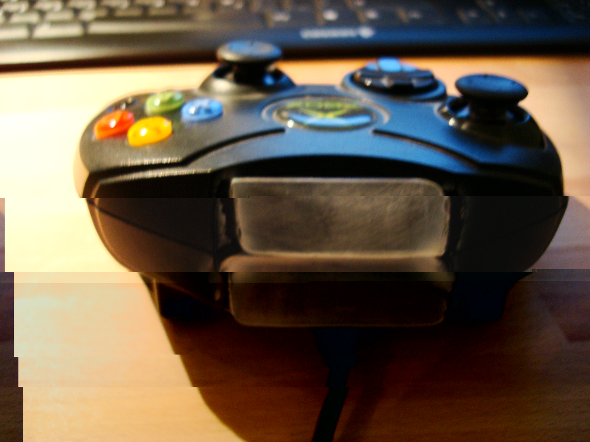 Also hab ich den Contoller erst einmal aufgeschraubt: und an den linken Drehmotor (der die Vibrationen im Controller hervorruft) eine weiße und eine blaue LED -und passende widerstände- gelötet.