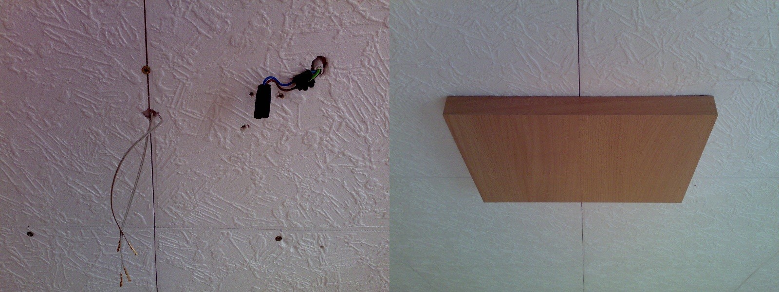 Die Anschlusskabel passen recht gut zwischen die Styroporplatten gedrückt. So konnten sie ohne Probleme unsichtbar bis zum Stromanschluss in der Decke gelegt werden. Hier findet die später erwähnte Steuerung und das Netzteil unter einer Holzhaube Platz, welche nach selbigem Prinzip mit Magneten unter der Decke bleibt.