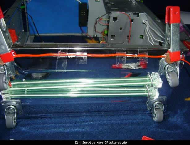 Der Unterboden wurde mit 4 Gummirollen versehen und mit Chromefolie beklebt,eine Grüne und Rote Unterbodenbeleuchtung mußte natürlich auch her.