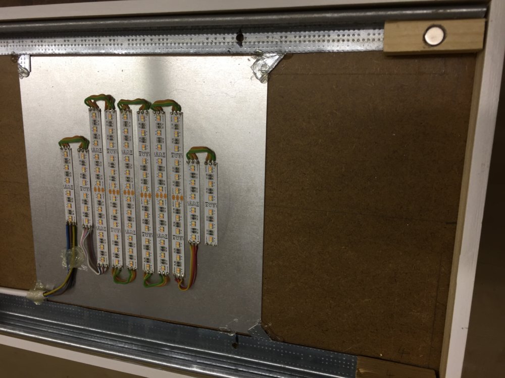 Dimmerelektronik mit SzeneSwitch, ich habe jetzt ze Stufen programmiert, 25% Helligkeit ww, und 100% w. Durch den automatischen Weißabgleich sieht man den Unterschied in den Bildern nicht, in Natura schon.