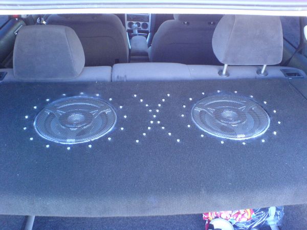 Kofferraum. Unten eine Aluleiste mit UV Leds. Unter der Hutablage Kabelkanal mit Leds.