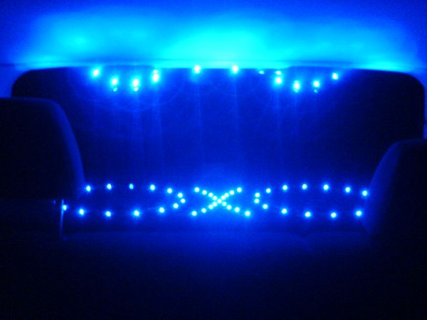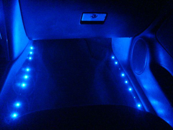 50 x 3mm blaue leds im linken fußraum und im kabelkanal.
