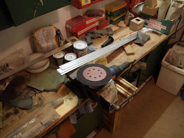 Tag 1 beginnt damit, die Aluleisten erst einmal zu säubern und die Oberfläche auf Vordermann zu bringen. Die Aluleisten hab ich am Schrottplatz gefunden und passen ideal für mein Projekt. Und bei 12€ für alle sag ich nicht nein. Zu beginn wollte ich die Leisten wieder auf hochglanz polieren aber das ließ ich aufgrund des hohen Arbeitsaufwandes schnell wieder gehn. Also wurde mit der Hand geschliffen. Auch das Ergebnis stellte mich nicht zufrieden... Also die Auto Poliermaschine genommen, ein Haft-Schleifpad drauf und schon wurde aus den Leisten brushed Metall ;)