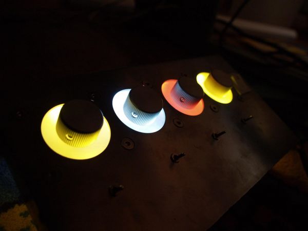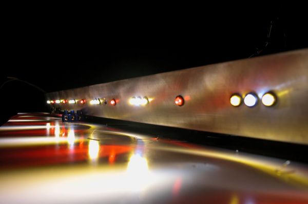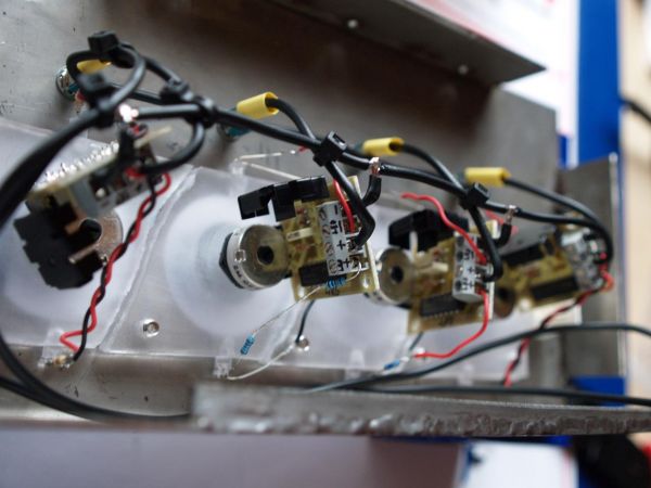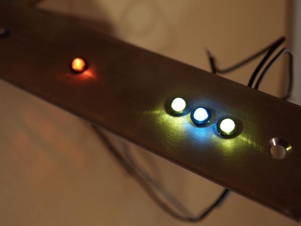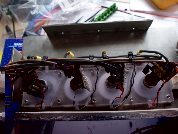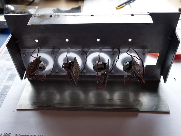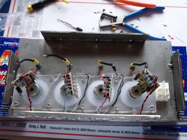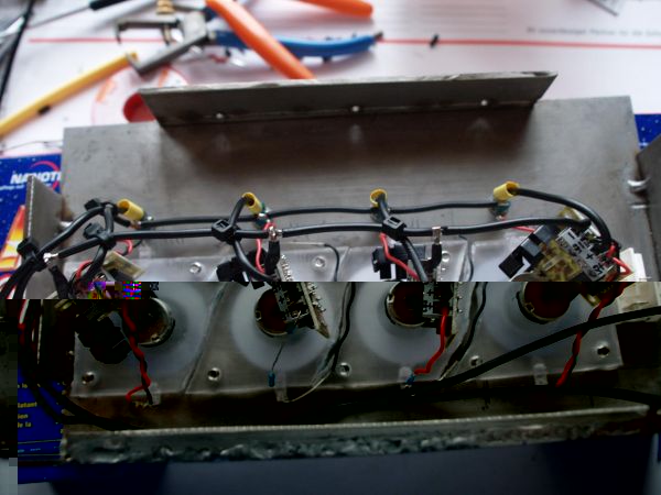 Des weiteren wurden schon mal aus Neugier 4 Leds in die Leisten eingesetzt. (Kabelgewirr mal bitte nicht beachten)