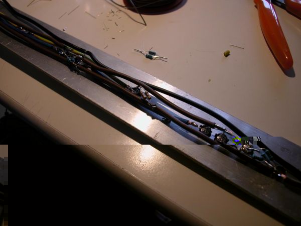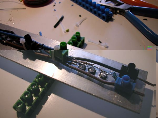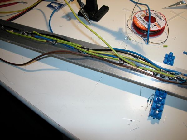 Auf diesem Bild sind die Übergänge für die anderen Leisten zu sehen. D.h. alle Leitungen werden vorraussichtlich mit Lüsterklemmen verbunden. Aber ganz sicher ist das noch nicht, da der Platz doch recht eng ist. Wenn nicht werde ich es mit Flachsteckern aus dem KfZ Bereich nehmen.