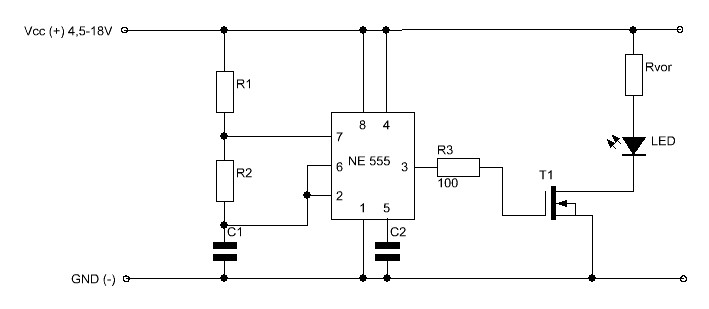 Die Schaltungen beginnen zu arbeiten, sobalt die Versorgungsspannung anliegt. Diese Schaltung erzeugt in Abhängigkeit der Widerstände R1 und R2, sowie dem Kondensator C1 ein gleichmäßiges Rechtecksignal. Funktion der Bauteile: