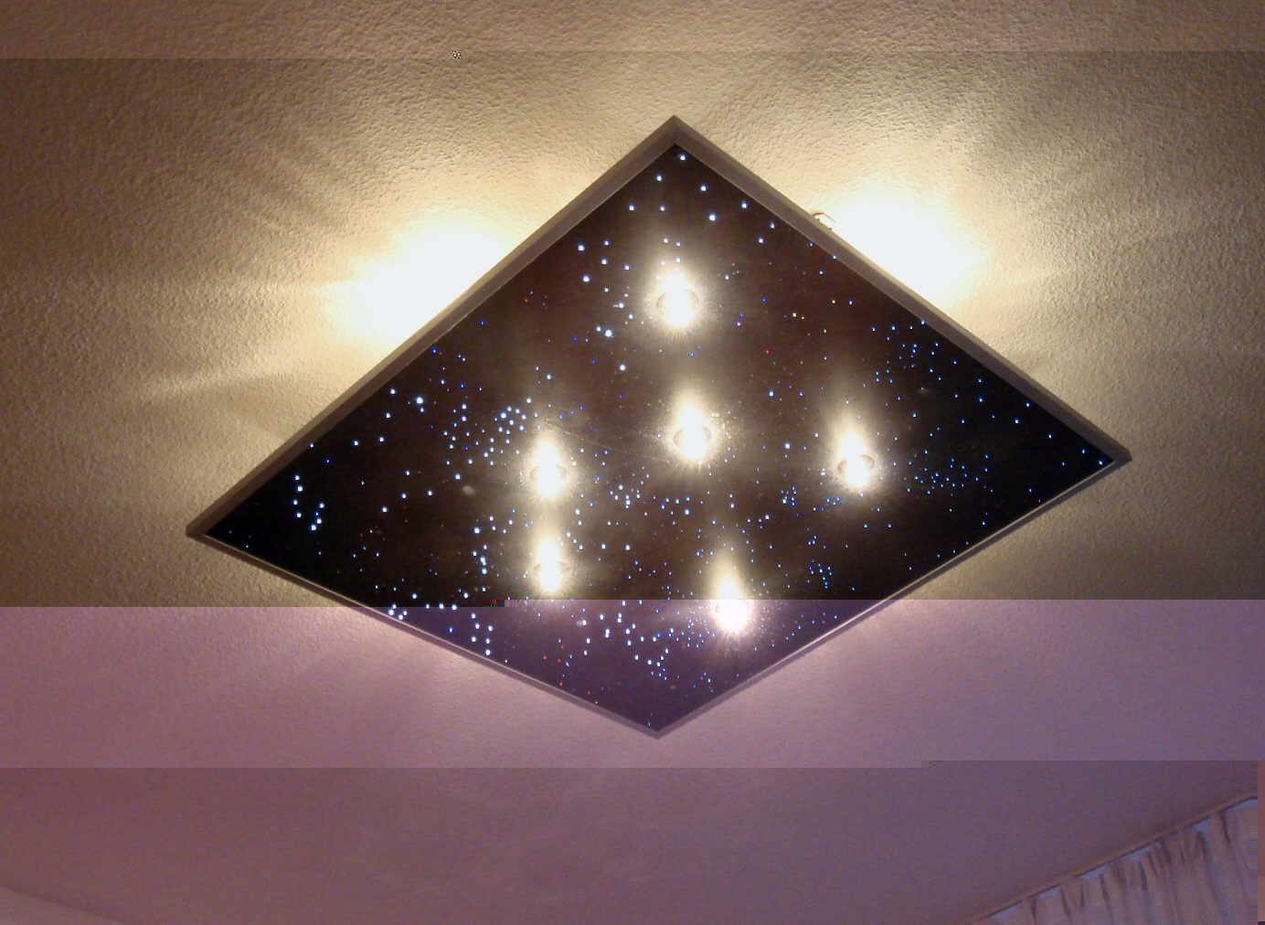 . Da ich gerne meine Freizeit unter anderen mit solche (Bastel-)Arbeiten gestalte, habe ich mir schon Gedanken gemacht für ein größeres Projekt. Ich hätte gerne auch einen Sternenhimmel und das im Wohnzimmer über unsere Couch. Ein bißchen größer... Beleuchtung in weiss gehalten... vielleicht mit leichtes teilweise bläuliches flimmern... hinter den Absatz versteckt mit blauen LED´s für dezente blaue Deckenflutung...der Größe entsprechend mit mehr Halogenleuchten. Eben für die gemütlichen, uns bevor stehenden, Winterabende. Aber da spielt leider die Frau noch nicht mit. Sie findet die langweiligen Halogenstrahler auf den Schienen genauso gut.